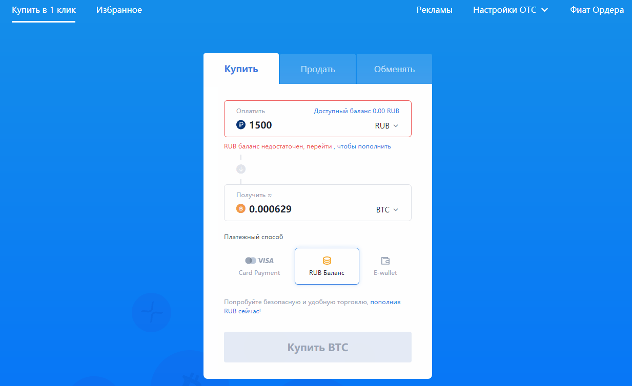 После пополнения внутреннего фиатного кошелька нажмите на кнопку «Фиат» на главной странице криптобиржи. Произойдет переадресация на c2c.huobi.com, в открывшемся окне нужно выбрать криптовалюту, задать объем покупки и нажать на кнопку «Купить». По той же схеме можно обменивать одну крипту на другую на внебиржевом рынке.