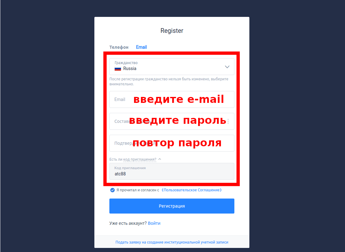 Регистрация в HTX проходит по стандартной схеме: