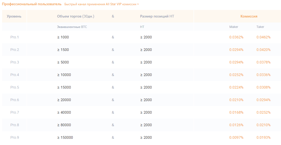 Для профессиональных пользователей предусмотрено 9 уровней. Помимо объемов в НТ выдвигается требование по месячному обороту в Биткоинах, необходимо одновременное выполнение обоих условий.