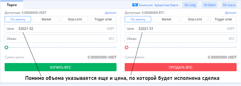 - По лимиту. Отложенный тип ордеров, задается не только объем сделки, но и цена, по которой она будет открыта. Информация об этом хранится на стороне HTX, после выставления лимитного ордера он исполнится, если график достигнет заданной цены даже при выключенном на стороне трейдера ПК. Если задать уровень исполнения на большом расстоянии от рыночной цены, то приказ может не исполняться длительное время или не исполниться вовсе, если график не доберется до заданной отметки.