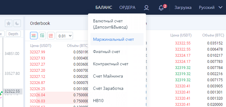 - В личном кабинете во вкладке «Балансы» выберите пункт «Маржинальный счет». На счете для спотовой торговли занимать токены у биржи не получится, для работы с плечом создан отдельный тип счета.