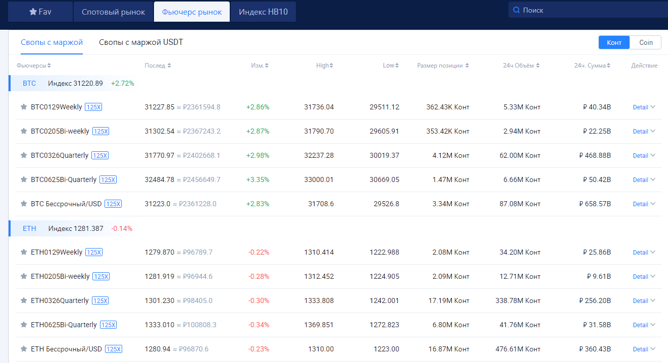 Если перейти во вкладку «Market», то в табличной форме будут отображены все пары, доступные на криптобирже. Приводится основная информация по ним, а нажав на «Detail» можно получить небольшое резюме по торгуемой криптовалюте. Здесь же дается информация по фьючерсному рынку и индексу HB10.