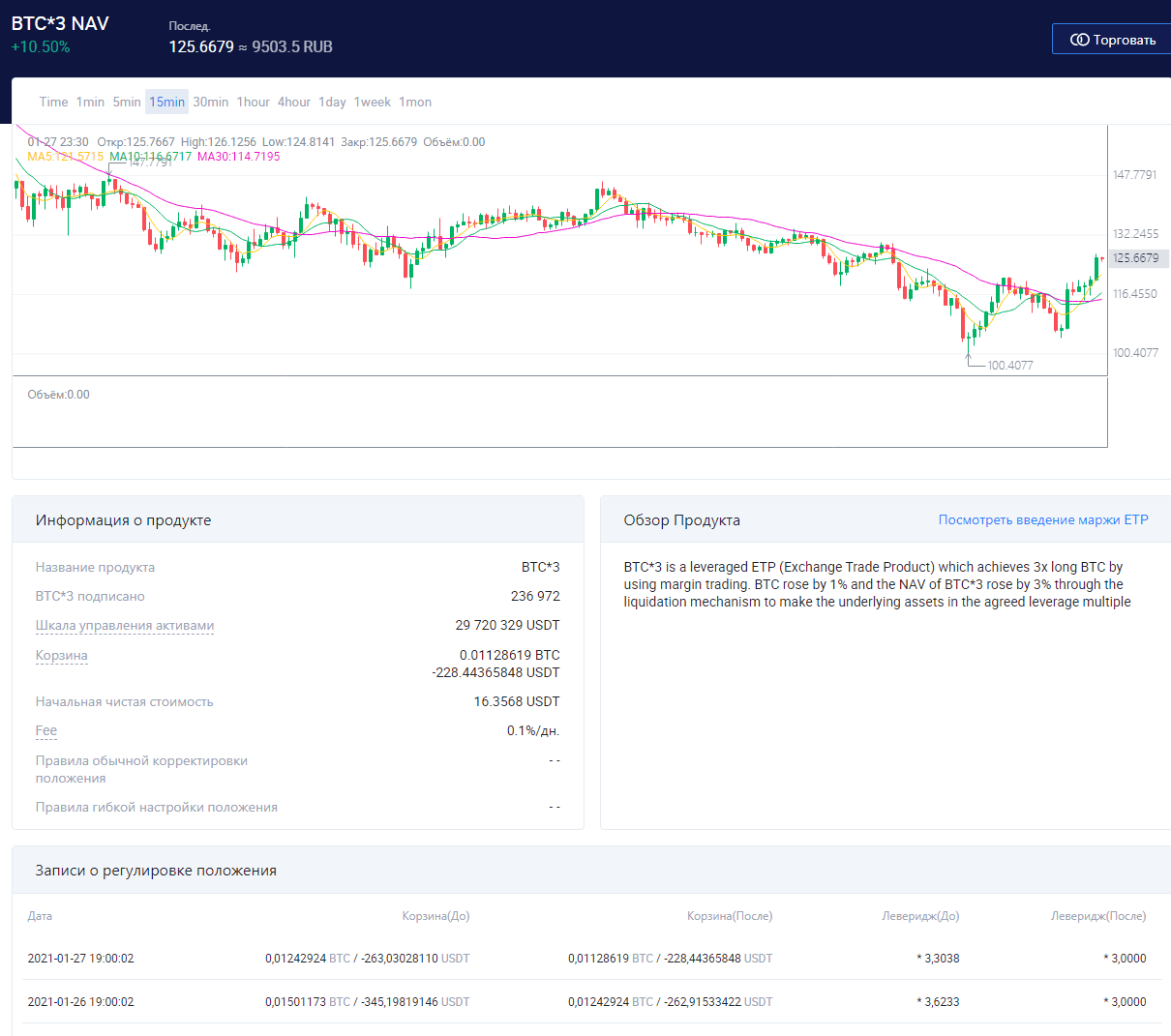 ЕТР создаются далеко не на все криптовалютные пары. По сравнению с криптопарами доступно на порядок меньше ЕТР. Чтобы перейти к торговле достаточно в терминале нажать на кнопки 3X Long, 3X Short или выбрать в перечне активов криптопары с соответствующими пометками в названии. Если в терминале нажать на кнопку «Раскрытие информации», в отдельной вкладке откроется детализация по выбранному ЕТР.