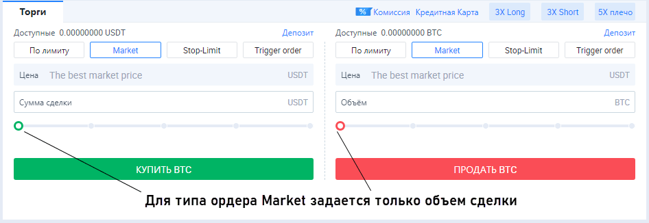 - Market. Стандартная покупка/продажа по лучшей цене. Заявка отправляется в стакан сразу же после нажатия на кнопку «Купить» или «Продать». Если пара высоколиквидная, то приказ исполняется практически мгновенно.