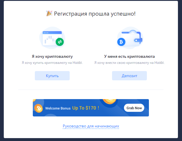 - На этом регистрация завершена, вам предложат сделать перевод на кошелек HTX или купить крипту. В момент подготовки обзора действует предложение с приветственным бонусом на сумму до $170. Деньги раздают не просто так, а за выполнение ряда заданий, например, если объем спотовой торговли достигнет $1000, то клиент получит Поинт карту на $40.