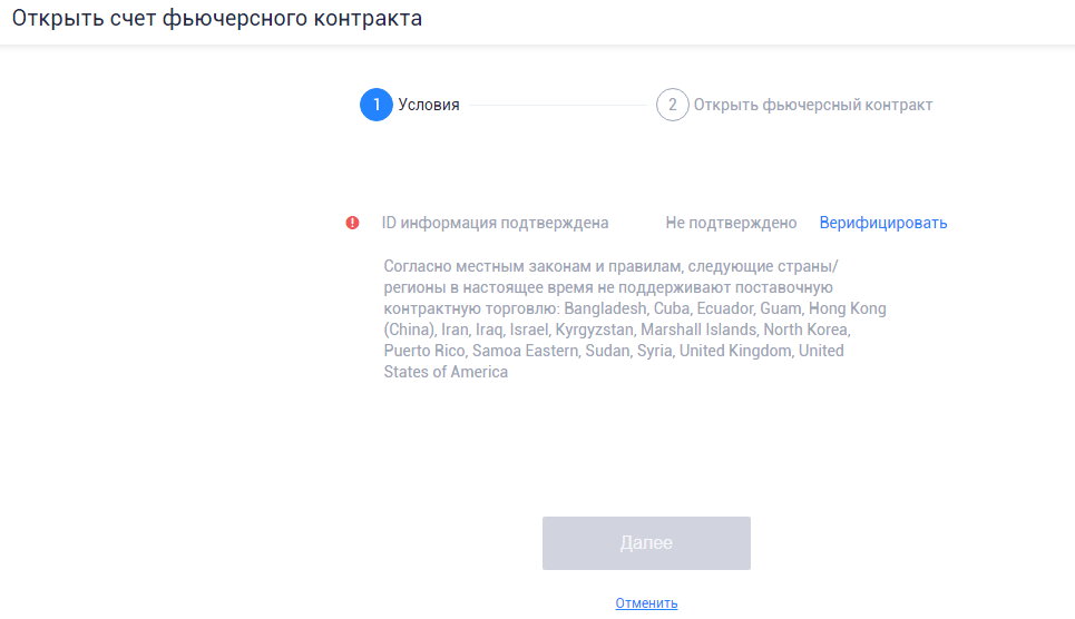 Торговля фьючерсными/опционными контрактами открывается отдельно, для этого нужно пройти верификацию. Есть и географическое ограничение – в ряде стран поставочная контрактная торговля не поддерживается.