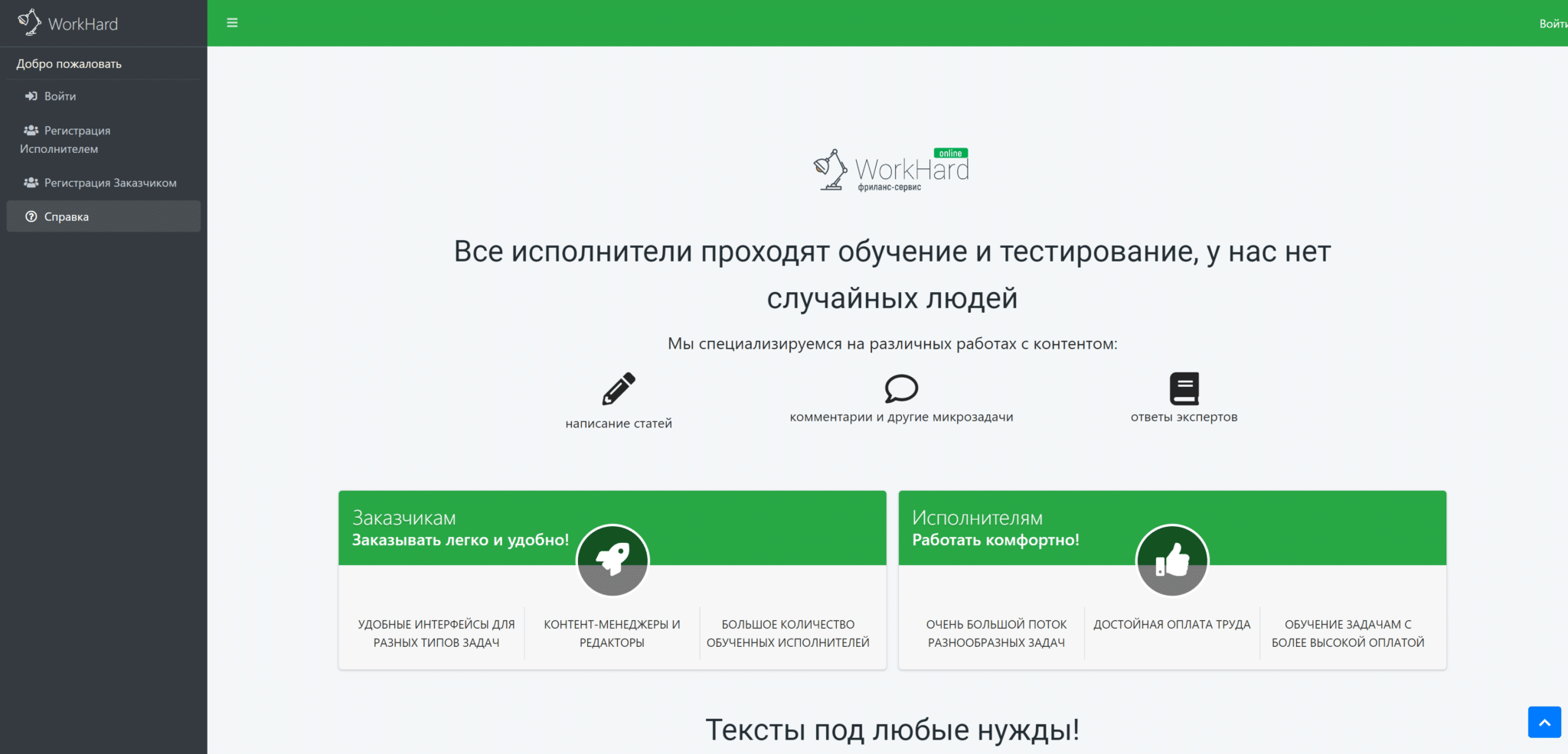 Биржа появилась в 2007 г., предлагает примерно тот же функционал, что и Etxt. Основное направление – написание текстов под заказ, но можно найти исполнителя для работы с фото, видео и аудио.