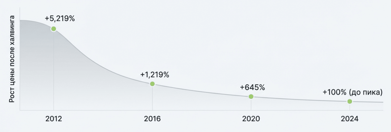 По данным исследования Kaiko, рост цены после халвинга 2012 составил +5,219%, после 2016 — +1,219%, после 2020 — +645%, после 2024 — около +100% до пика (и отрицательный результат к концу года). Тренд на снижение отдачи очевиден.