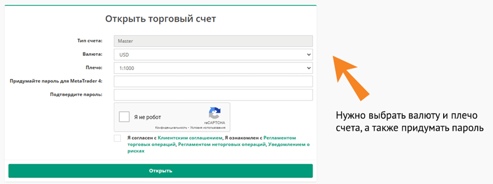 - При открытии счета трейдер выбирает валюту, плечо, придумывает пароль и подтверждает свое согласие с Клиентским соглашением.