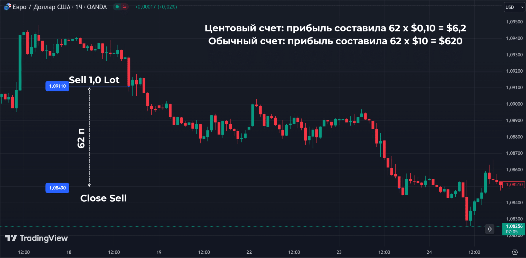 Пример выше иллюстрирует разницу в возможной прибыли на одном и том же участке рынка. При объеме сделки 1,0 лот стоимость пункта составит $10 на обычном аккаунте, прибыль по сделке – $620. Если использован центовый депозит, то стоимость пункта снижается до 10 центов, из-за этого прибыль снижается в 100 раз – до $6,2. По той же логике меняется размер стоп-лосса.