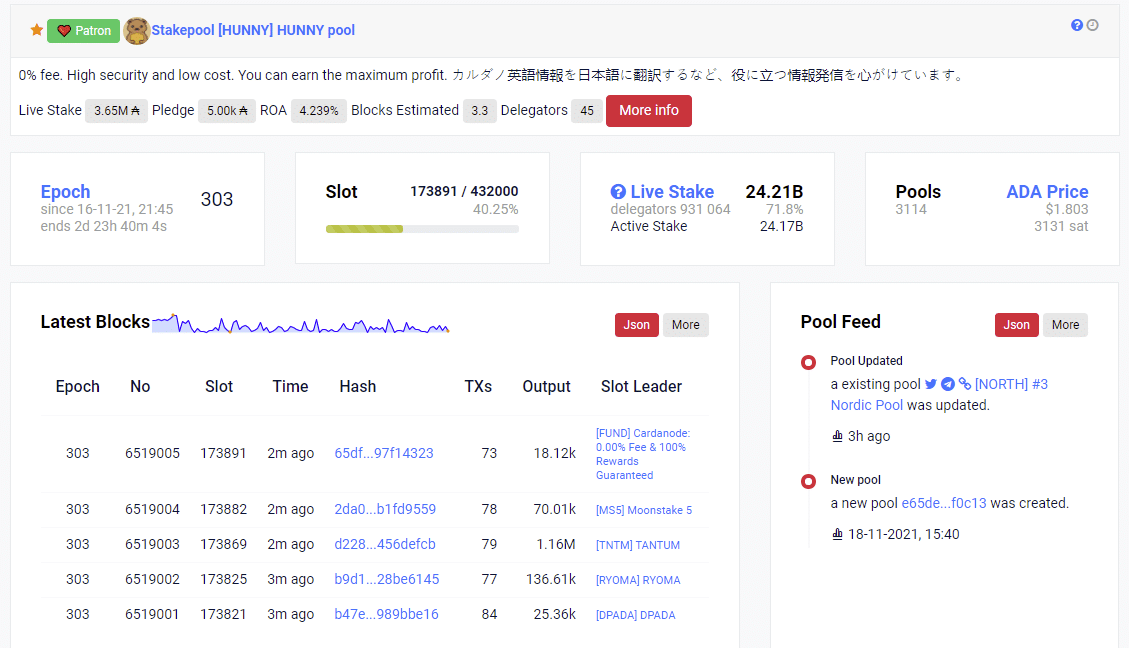- Каждый из узлов будет номинироваться на роль лидера слота в среднем 1 раз в 20 секунд. То есть за время существования эпохи каждый узел будет номинирован на роль лидера 21600 раз. На adapools.org отображается информация по текущей эпохе, дате ее начала и окончания. Например, на момент подготовки обзора идет 303-я эпоха, она завершилась 21 ноября 2021 г.