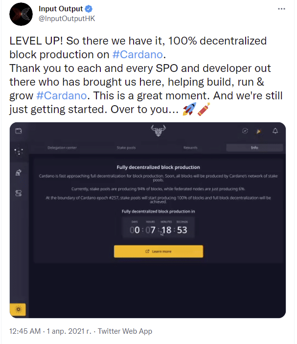 В этот день сеть, ранее состоявшая из 7 узлов, делегировала свои полномочия широкому пулу валидаторов. Фактически центральный регулирующий орган передал всю власть криптовалютному сообществу, с этого момента IOHK не несет ответственность за создание блоков.