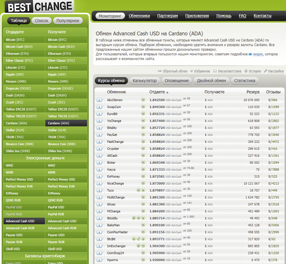 - Покупка через интернет-обменник. По сравнению с биржей вариант удобнее так как не нужно регистрироваться на торговой площадке. Единственный недостаток – несколько большая комиссия по сравнению с работой через биржу. Отслеживать курсы можно на любом агрегаторе обменников, например, на bestchange.