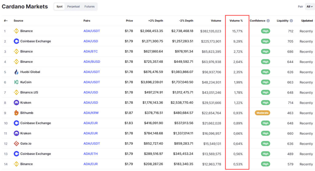 - Купить криптовалюту Cardano на бирже. Максимальный объем торгуется на Бинанс и Coinbase, можно работать и на других площадках, но на 2 перечисленные приходится более 25% от общего торгового оборота. Что касается покупки, то все сводится к регистрации на бирже, пополнению счета и отправке приказа через торговый терминал. Это несложно, на заключение сделки уходит буквально пара секунд.