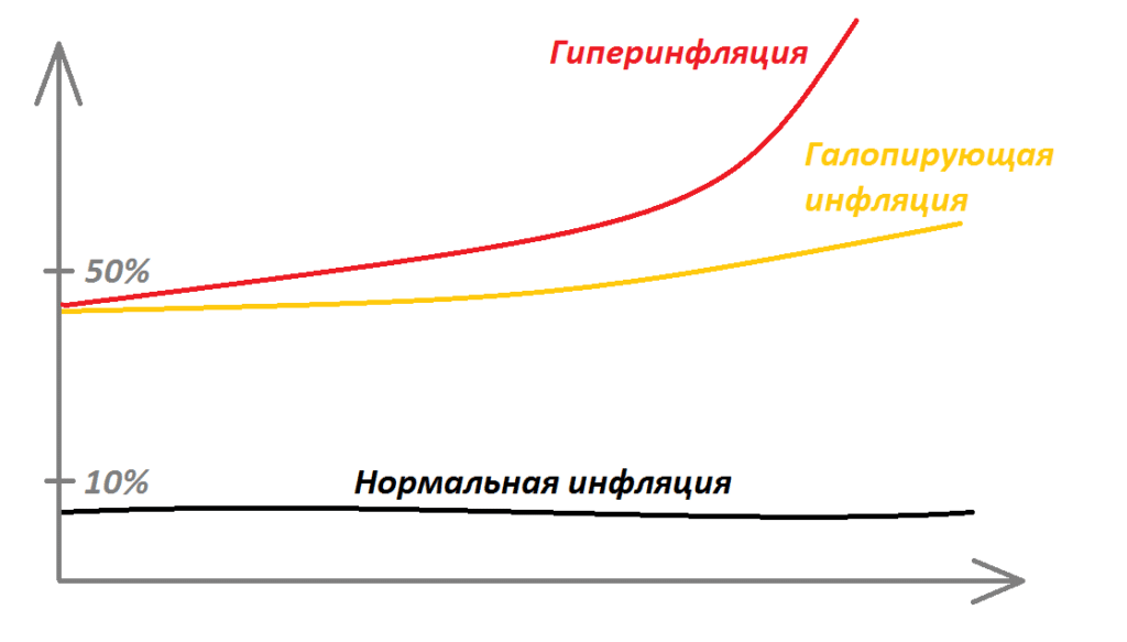 - Гиперинфляция. Показатель выше 50%, как правило, далее начинается ускорение и в итоге всё заканчивается уже сотнями, тысячами и даже более процентов. Свойственно серьёзным экономическим кризисам.