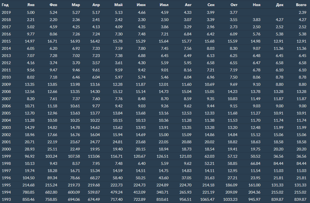 В России достаточно высокий уровень инфляции, если сравнивать с развитыми странами. Данные публикуются Росстатом ежемесячно и показывают текущее значение, которое может сильно варьироваться от месяца к месяцу. Таблица выглядит следующим образом: