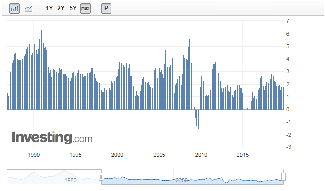 - США – инфляция 2-2,5%. Это нормальный показатель, который ФРС рассматривает как нужный экономике. Во время последнего кризиса из-за роста курса доллара временно наблюдалась дефляция.