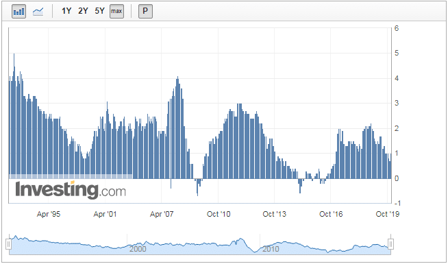 - Евросоюз – инфляция примерно 1,5%. Европейцам тяжело даётся рост инфляции к нормальным значениям, бывают длительные провалы. Последний раз такое произошло с 2013 по 2016 год.