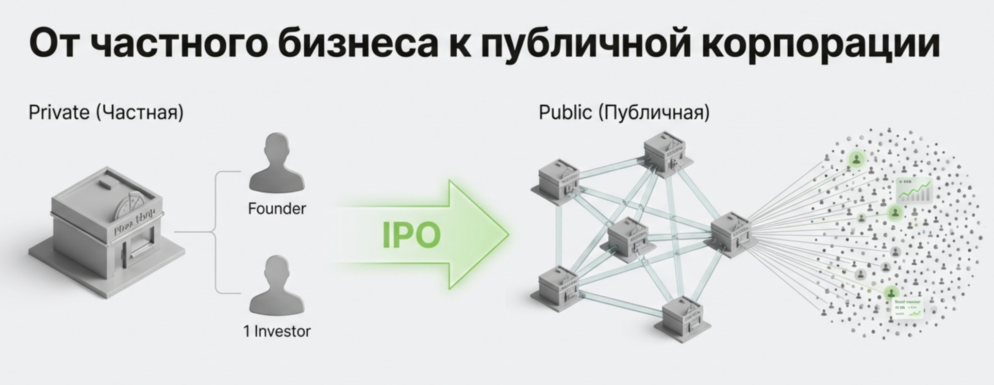 До IPO компания называется «частной» или «непубличной». Её акции нельзя просто так купить — они принадлежат основателям, их семьям, ранним инвесторам, иногда сотрудникам. Чтобы стать совладельцем такой компании, нужно лично договариваться с текущими акционерами, а они, скорее всего, откажут незнакомцу. После IPO компания становится «публичной»: её акции торгуются на бирже, и любой человек с брокерским счётом может купить хоть одну акцию, хоть тысячу — по рыночной цене, без переговоров и согласований.
