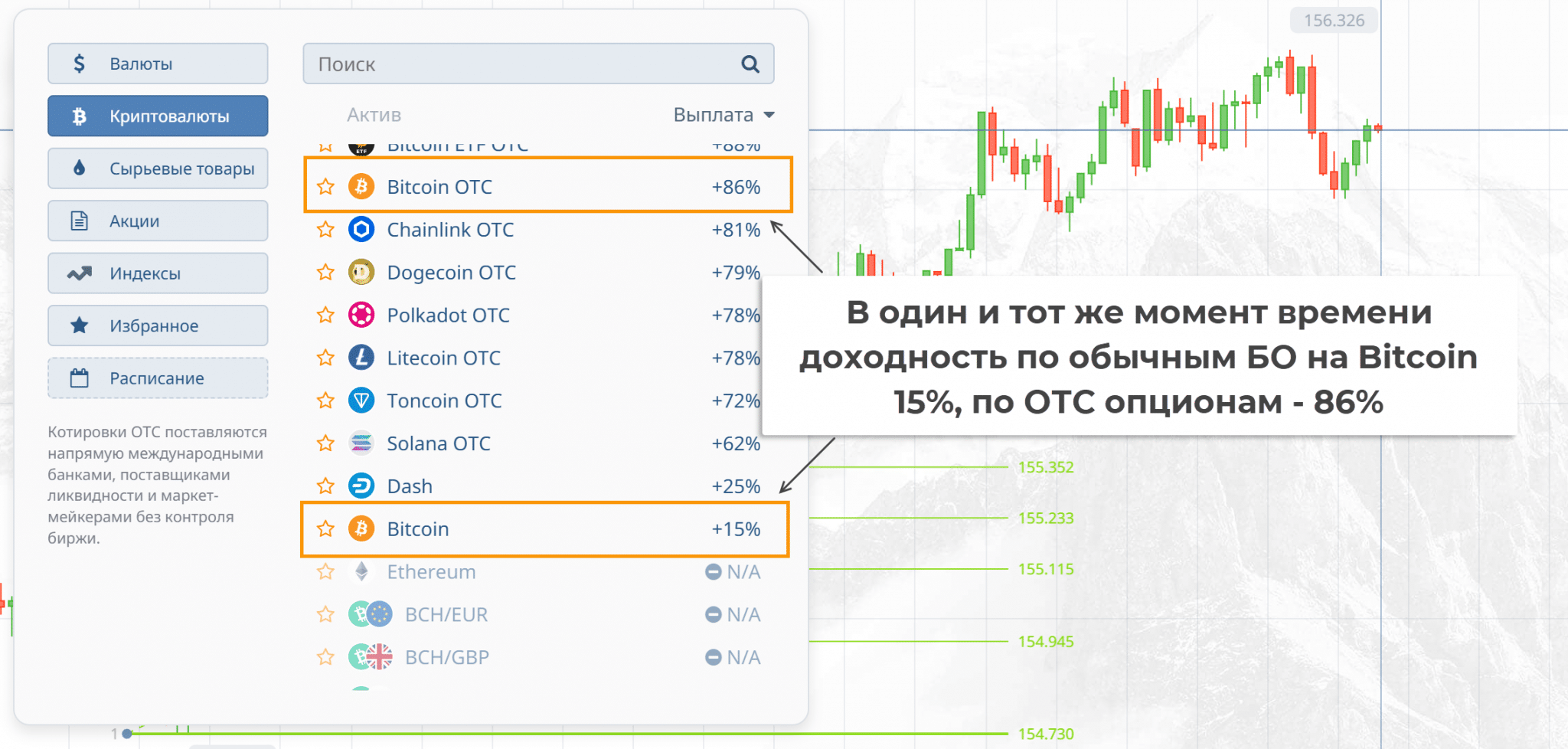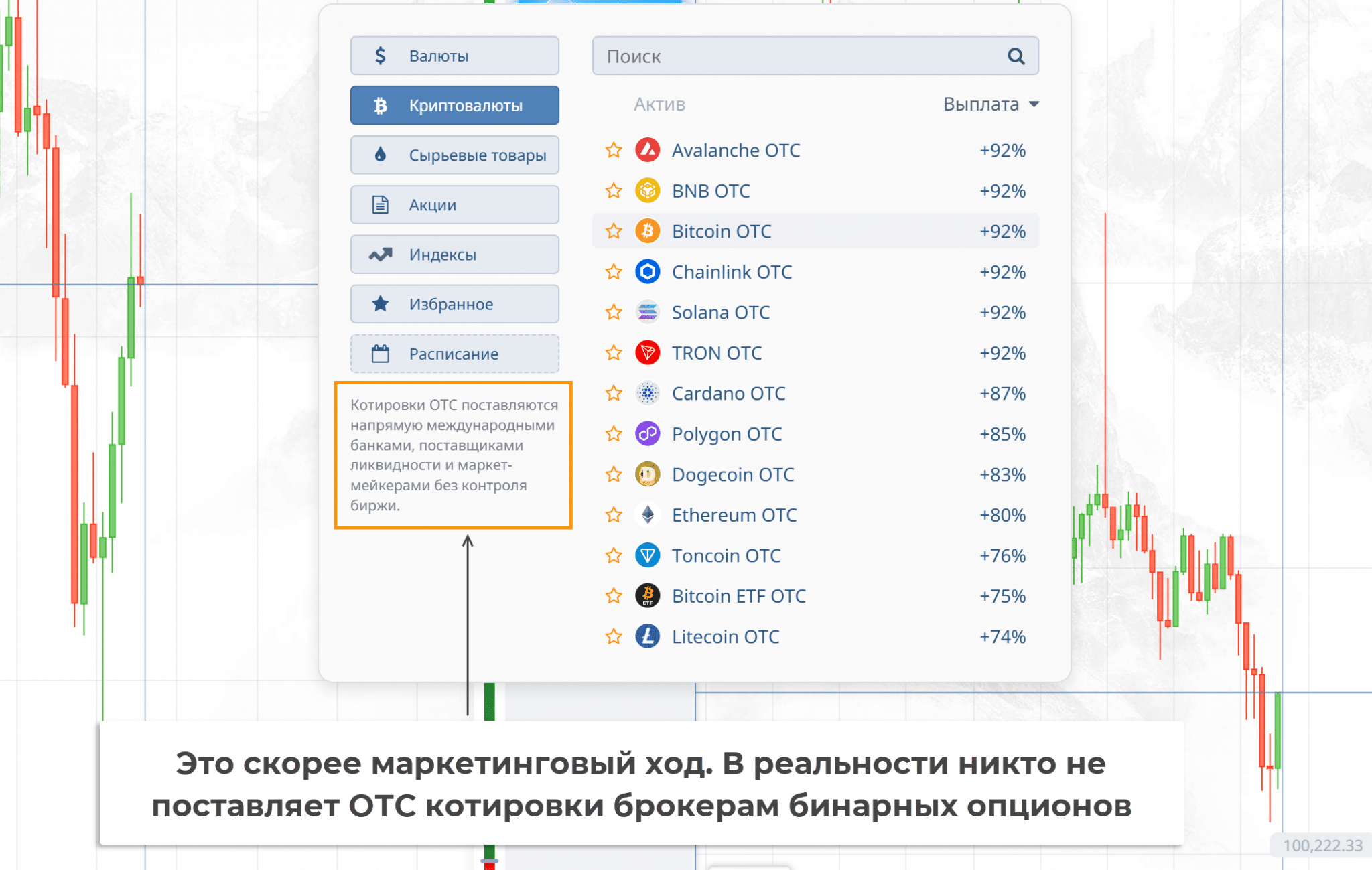 - ОТС активы могут быть доступны параллельно с обычными. Трейдер может работать, например, с Over the Counter котировками на ВТС, но в то же время доступны бинарные опционы на ВТС с реальными котировками.