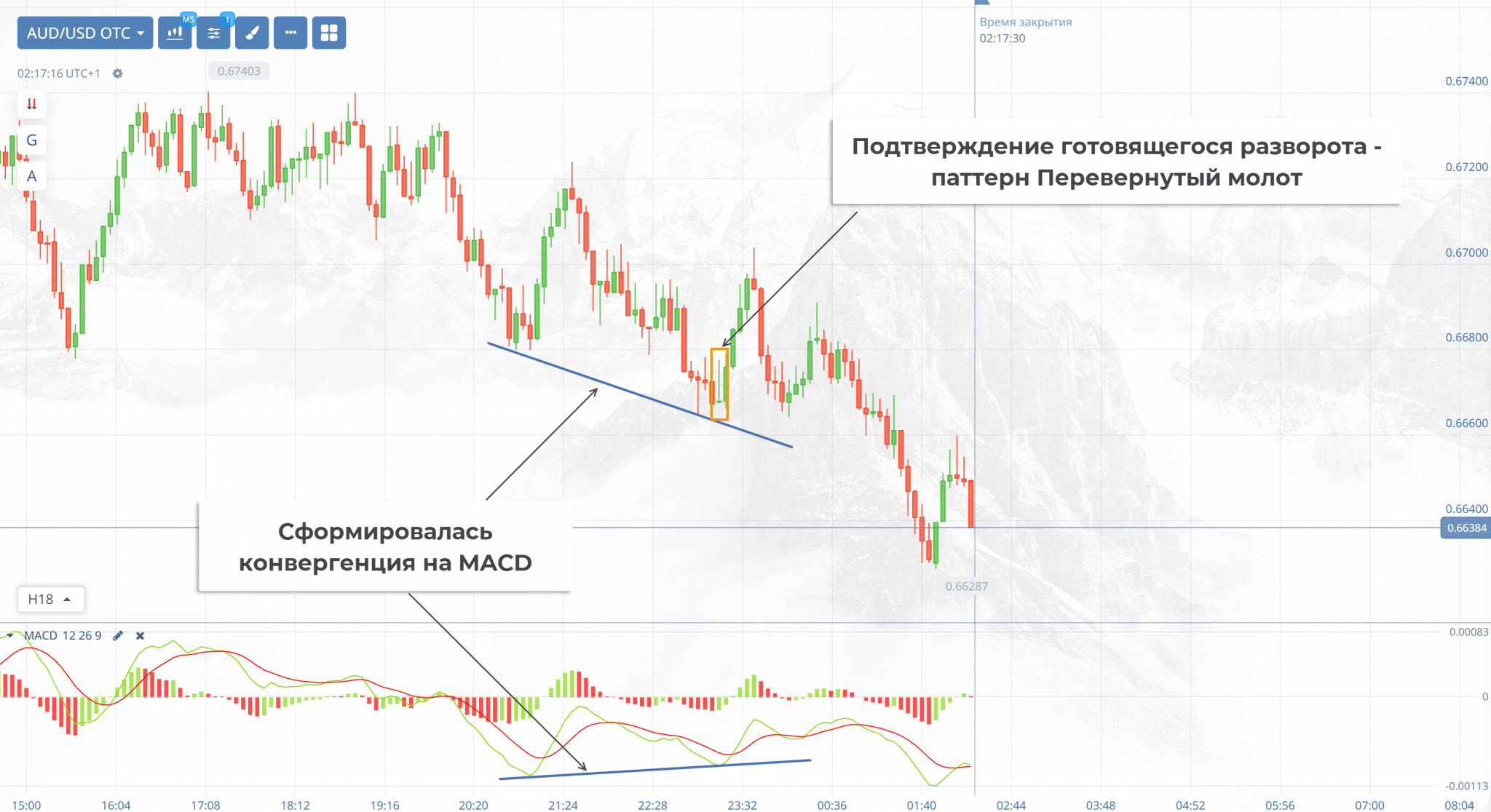 Работают и индикаторы, например, на MACD можно искать конвергенции и дивергенции, они работают ничуть не хуже, чем на реальном графике. Сигналы этого типа неплохо сочетаются с разворотными свечными паттернами.