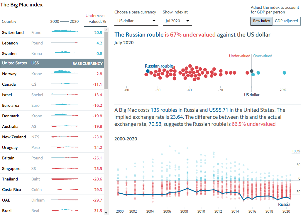 Например, в июле 2020 г. в РФ Биг Мак стоил $1,91 или 143,92 руб., а в США – $5,71. Это делает рубль одной из самых недооцененных валют мира.