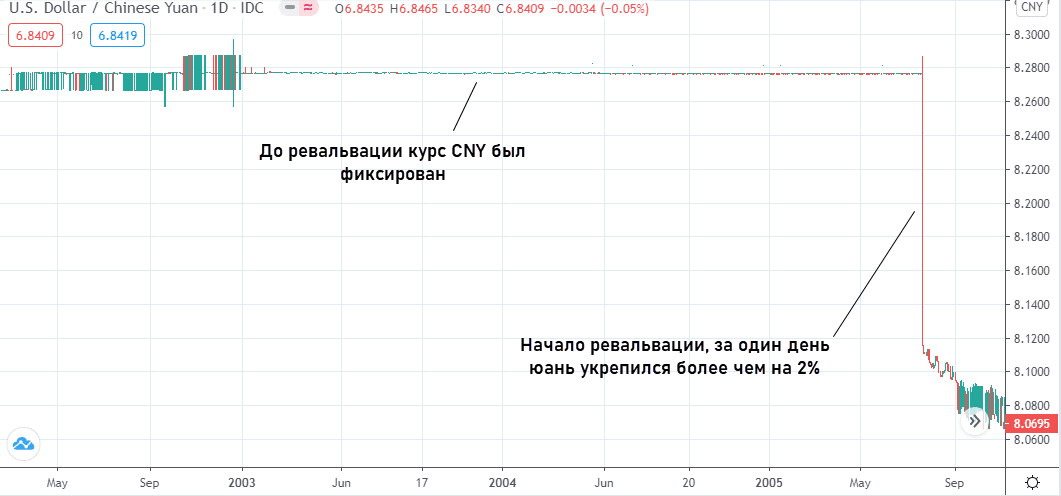 В отличие от ситуации с франком ревальвация китайского юаня оказалась растянута по времени. В июле 2005 г. Народный банк Китая сообщил, что юань отпускается в «свободное плавание», до этого курс был фиксирован, а график CNYUSD напоминал прямую линию.