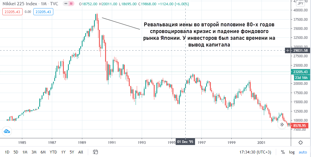 - внешнее давление. Япония в прошлом не смогла удержать иену на выгодном для себя уровне. В результате внешнего давления ее нацвалюта выросла практически в 3 раза меньше чем за 20 лет, что стало причиной масштабного кризиса.