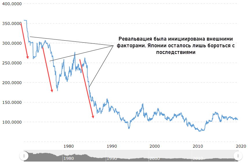 Иногда усиление нацвалюты проводится под давлением внешних факторов. Подобное произошло с Японией в 80-х годах прошлого века.