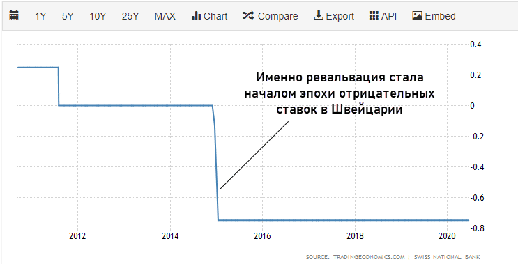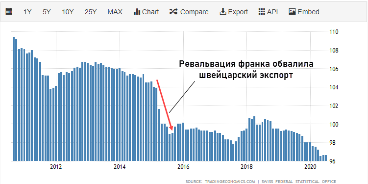 - при резкой ревальвации может «упасть» местный фондовый рынок. Это произошло после укрепления франка, последующее восстановление заняло более 2 месяцев.