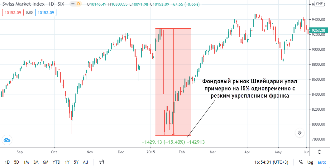 В итоге 15 января жесткая привязка курса CHF к EUR была отменена. В итоге за несколько часов швейцарский франк укрепился на 30+%. Это был шок, фондовый рынок Швейцарии за день упал на 15%.