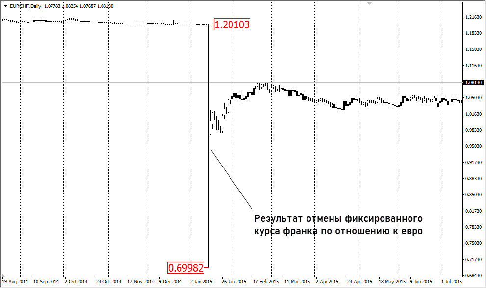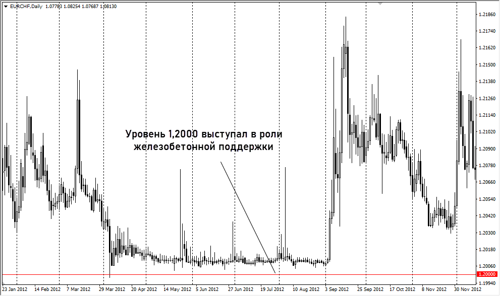 С 2011 г. швейцарский центробанк не допускал усиления франка в ручном режиме. Курс EURCHF искусственно удерживался не ниже 1,2000. При подходе графика валютной пары к этому уровню росла вероятность вмешательства ШНБ и корректировки курса. Это использовалось трейдерами для заработка.