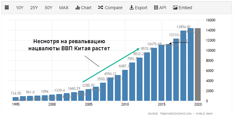 Бывают и исключения из этого правила. Так, в Китае укрепление юаня в нулевых не привело к падению ВВП, экспорт оставался востребован.