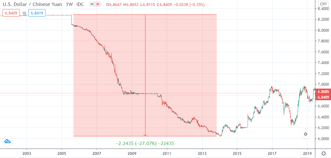 Процесс занял несколько лет, максимумов китайский юань достиг максимума в конце 2013 г. За это время нацвалюта КНР выросла на 27%.