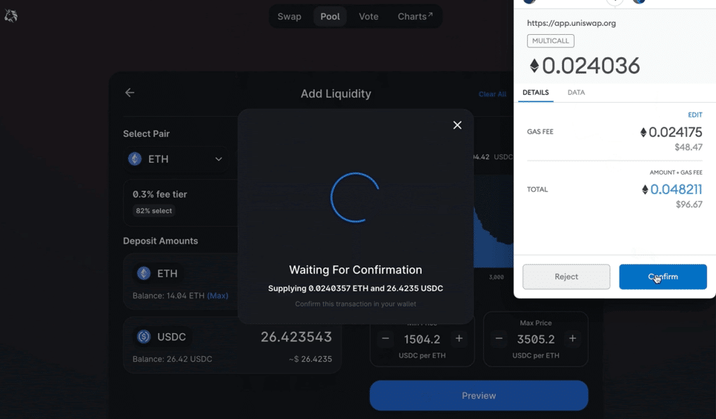 - В правой части задается диапазон цен. Это тот диапазон, в рамках которого должна оставаться цена, чтобы провайдер ликвидности получал вознаграждение в виде комиссии. Если курс выходит за пределы обозначенного диапазона, то позиция трейдера полностью сосредоточена в одном из активов. Он начнет получать вознаграждение только после возврата курса в заданный диапазон цен.
