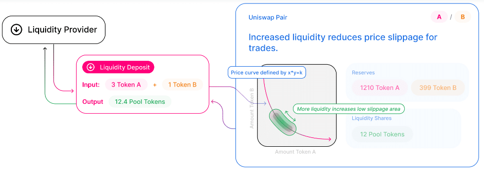 Неизменяемые смарт-контракты работают с так называемым пулом ликвидности в состав которого входит 2 криптовалюты. Поставщиком ликвидности может стать любой, для этого нужно депонировать (заморозить) определенную сумму в пуле, получив взамен некоторое количество токенов пула.
