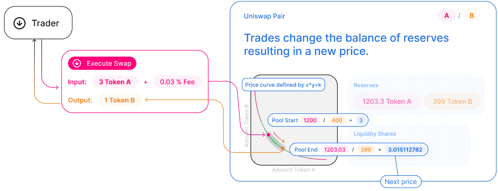 Uniswap – это полностью автоматизированный протокол ликвидности, обмен криптовалютами происходит за счет специальных смарт-контрактов. Это основа работы любой децентрализованной криптобиржи.