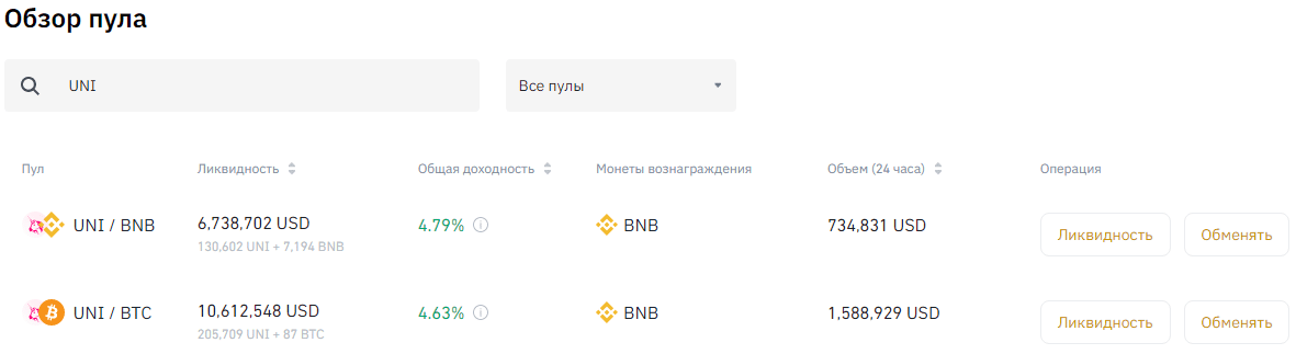 Также можно участвовать в пулах ликвидности на других биржах. На Binance доступны пулы UNI/BNB и UNI/BTC, доходность небольшая, но она гарантирована на 100%.