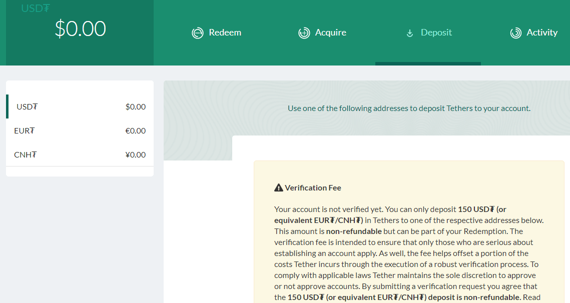 При переходе в раздел Deposit появится уведомление, сообщающее, что на счет можно внести не более 150 USDT. Это плата за верификацию, для полноценной работы через сайт придется пройти ее.