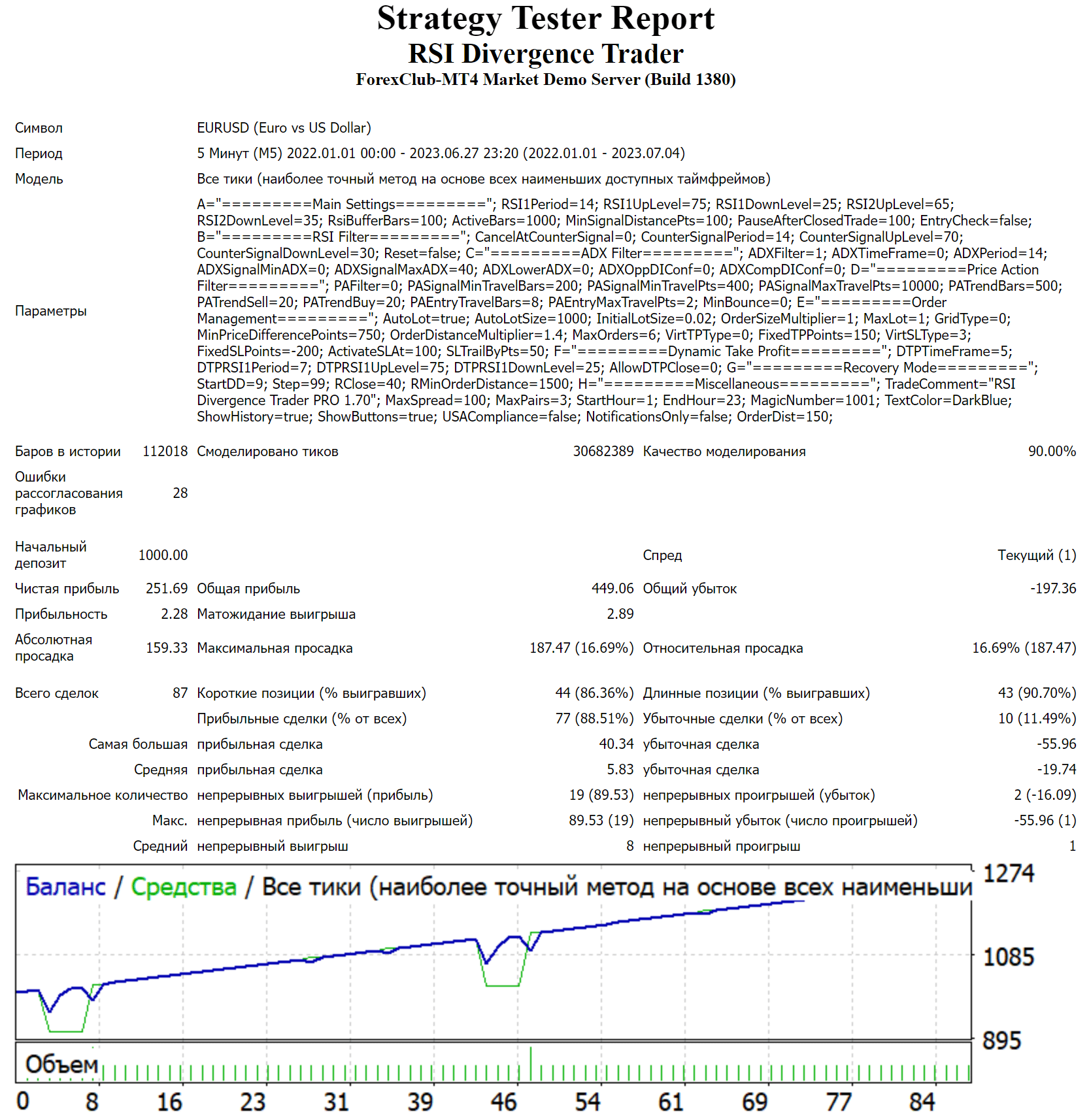 Учтите – это советник, а не ручной тест, его результаты можно рассматривать лишь как приближенное доказательство эффективности дивергенций. По отчету видно, что средняя прибыль в 3,5+ раза меньше по сравнению со средним убытком. При ручной торговле этот нюанс можно было бы устранить и повысить эффективность стратегии.