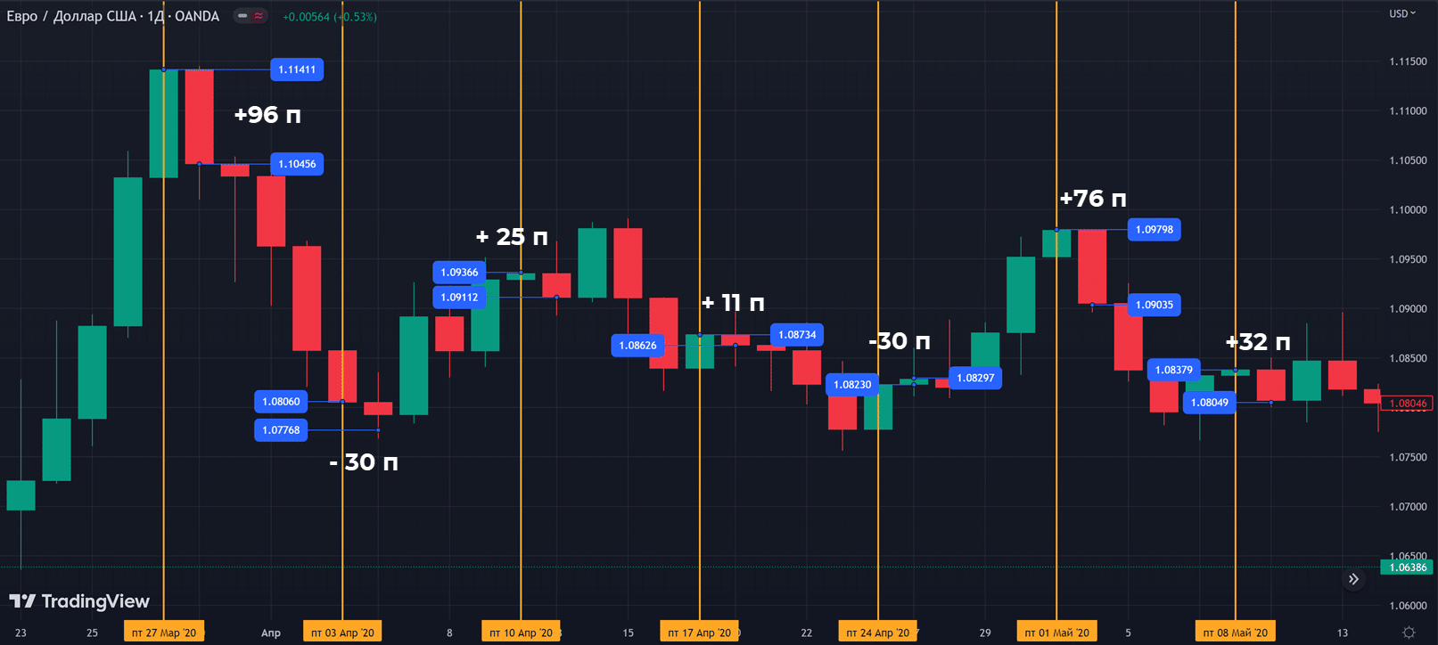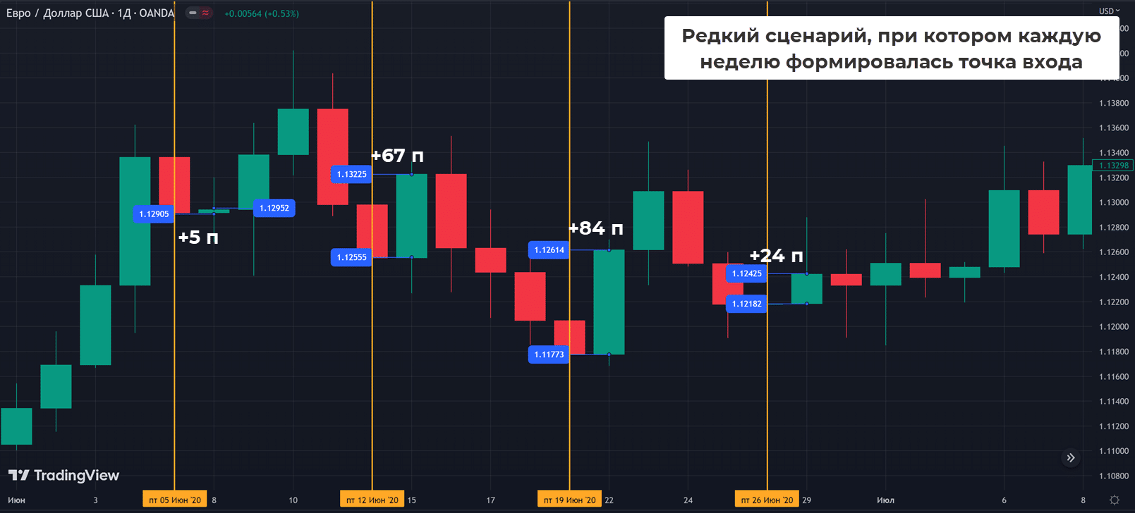 Идея стратегии основана на том, что в начале новой недели следует откат на пятничное движение. Формируется тень недельной свечи, ее и пытается взять трейдер.