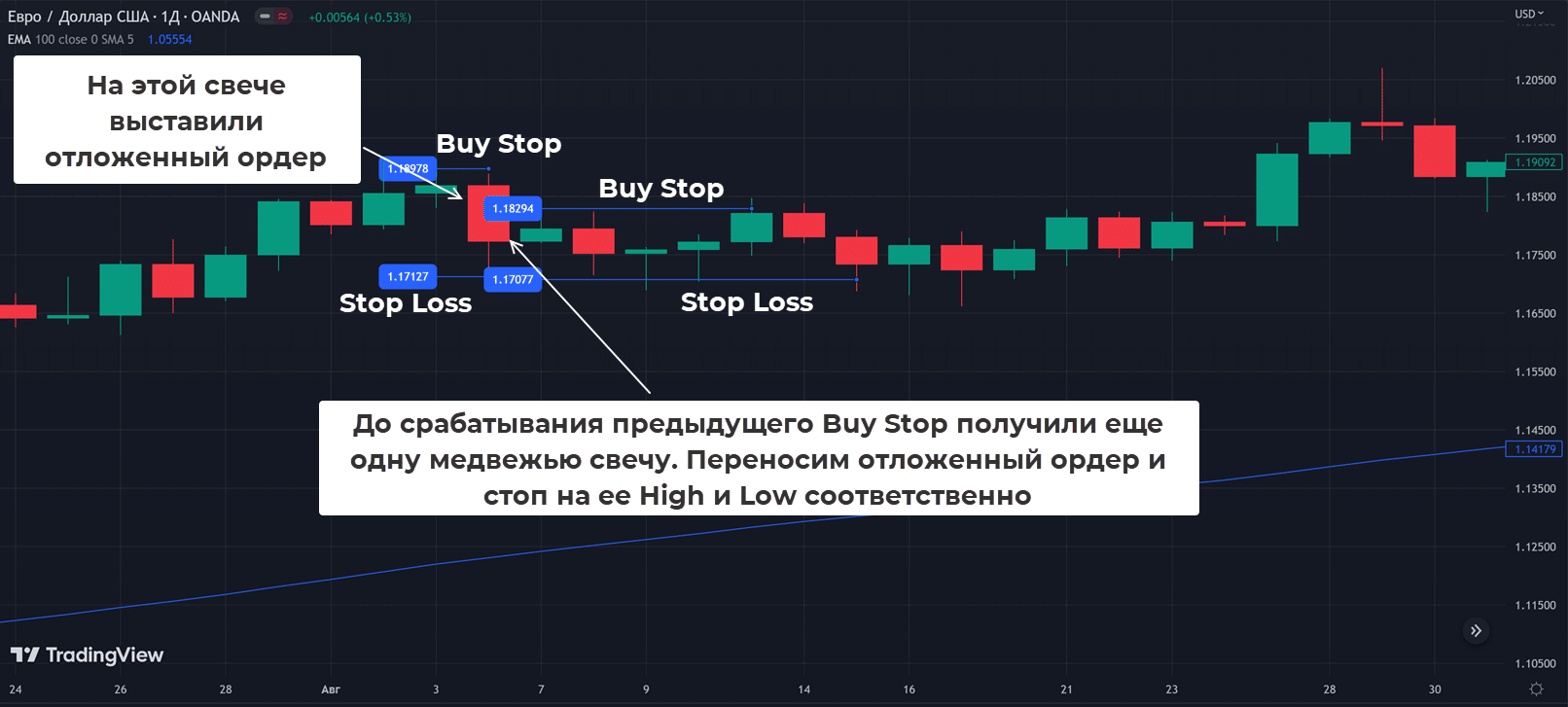 - Формируется медвежья свеча. Над ее максимумом устанавливается отложенный ордер на покупку. Стоп-лосс располагается под минимумом этой свечи. Если появляется новая медвежья свечка, то Buy Stop и Stop Loss переносятся уже на ее экстремумы.