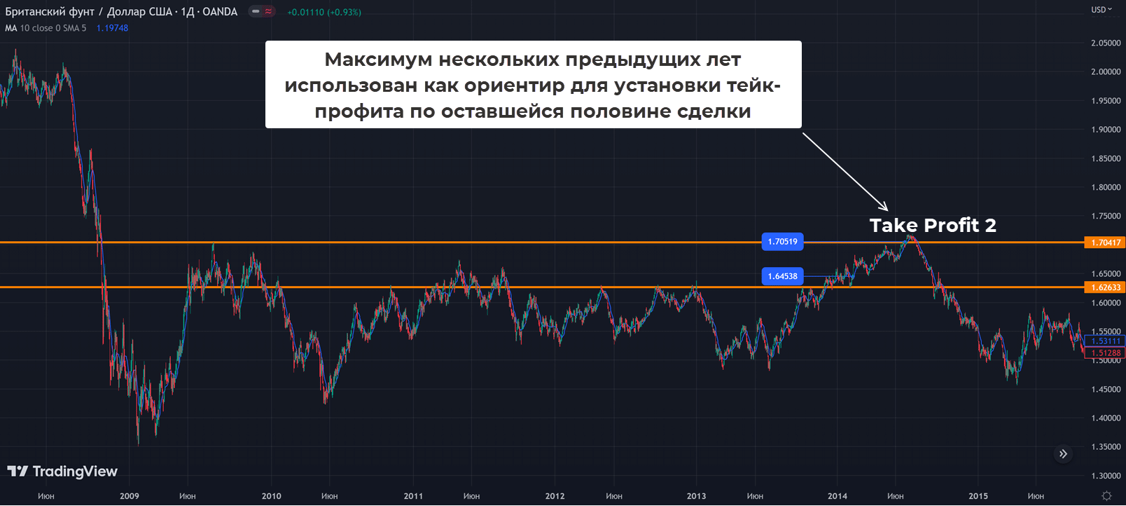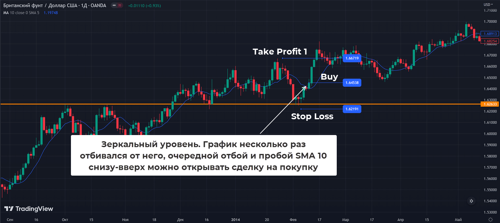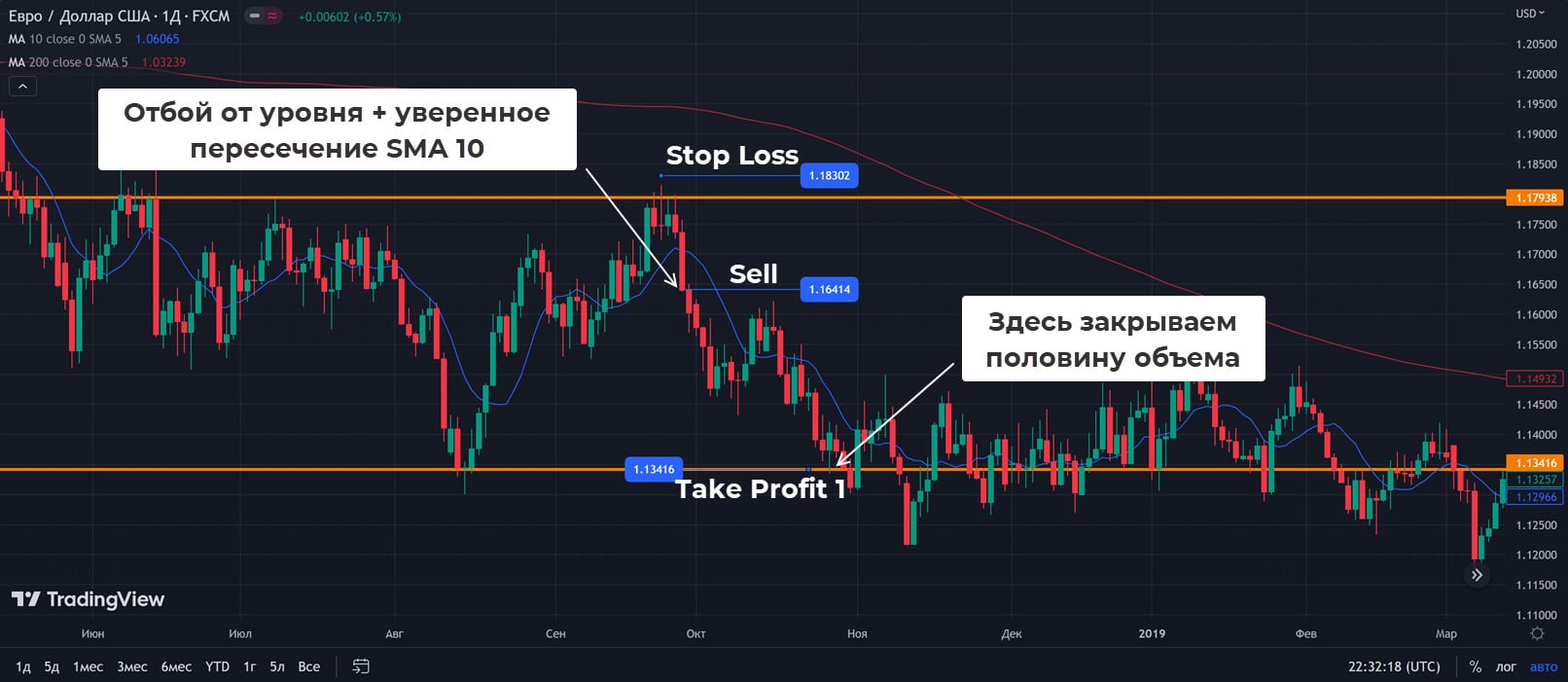 - Сделка заключается при закрытии графика над SMA10. Стоп выносится за локальный Low, первый тейк-профит равен 100 пунктам, соотносите его со стопом. Если Risk Reward оказывается на уровне 1 к 1, то сигнал лучше проигнорировать.