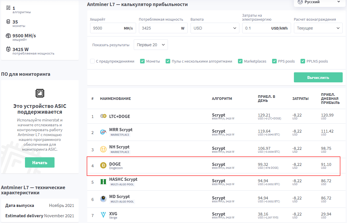 Для алгоритма Scrypt есть несколько мощных ASIC, но сроки окупаемости сильно зависят от текущего курса крипты. Приведем расчет для одного из самых мощных ASIC – модель Antminer L7 с хешрейтом в 9500 VH/s, устройство потребляет 3,425 кВт.