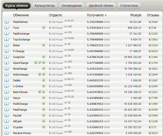 - Покупка в интернет-обменнике. Самый простой и удобный способ для новичков, комиссия зависит от обменника, но суммарные потери вряд ли превысят 4-6%. Деньги сначала отправляются на реквизиты обменника, затем сервис отправляет токены на кошелек покупателя. После нескольких подтверждений транзакции криптовалюта Dogecoin перечисляются на ваш кошелек. Курс практически совпадает с биржевым, например, по направлению Payeer USD – DOGE курс равен $0,1741, а биржевой – $0,1693. Разница составляет 2,84%, по другим направлениям она может быть еще ниже.