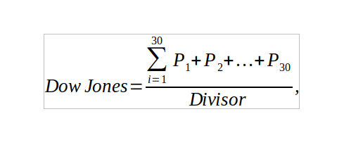 - P – цены акций, входящих в состав корзины, всего в числителе 30 слагаемых.