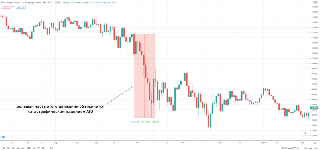 - Резкого изменения стоимости отдельных компонентов. Из-за игнорирования фактора капитализации обвал или резкий рост любого из компонентов корзины может спровоцировать такое же поведение всего DJIA. Хороший пример – падение на 3000 пунктов в 2008 г., основная причина этого заключалась в обвале котировок AIG. В том же S&P 500 такой сценарий исключен – корзина на порядок больше, к тому же фактор капитализации смягчил бы влияние стоимости бумаг AIG.