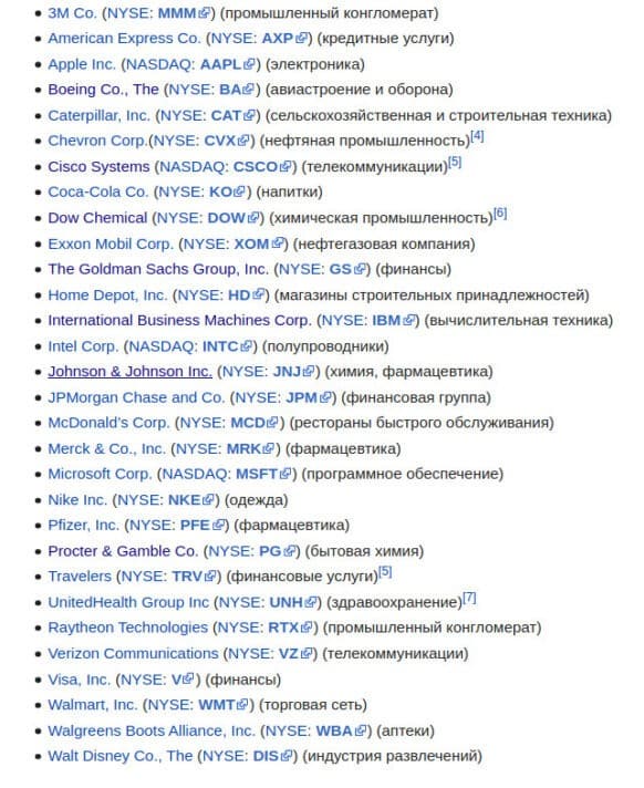 Полный список компаний из индекса Dow Jones
