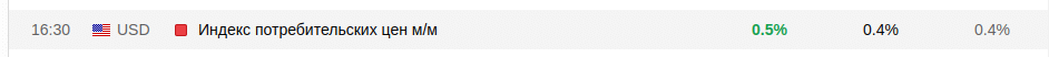 Ожидались данные на том же уровне что и в предыдущем месяце — 0.4%. И фактическое значение превысило прогнозируемое и составило 0.5%, что обозначается красным квадратом — высокой степенью влияния на рынок.