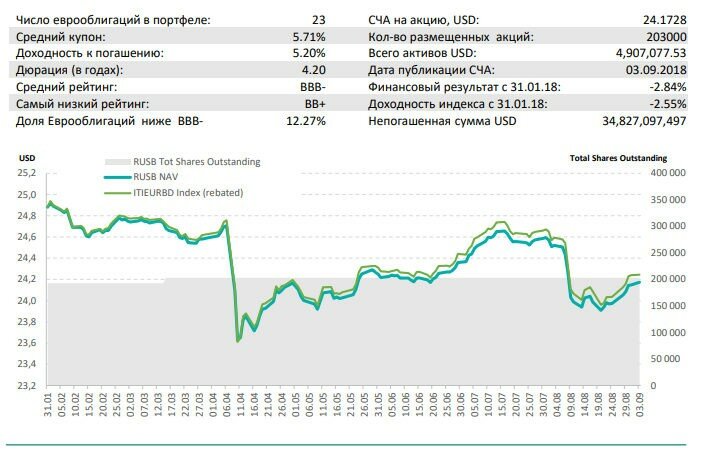 В соответствии со своей инвестиционной декларацией RUSB копирует индекс Russia—focused USD Eurobond Index (ITIEURBD Index), рассчитываемый аналитиками немецкой компании Solaсtive. Всего в составе индекса насчитывается 23 долларовые еврооблигации российских компаний с рейтингом не ниже суверенного, т.е. BB+.